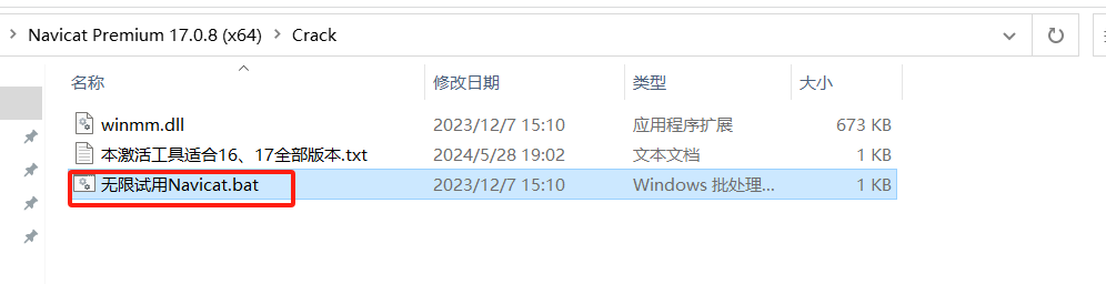 如果先前有安装过 Navicat Premium 话运行 “无限试用Navicat.bat” 删除注册表